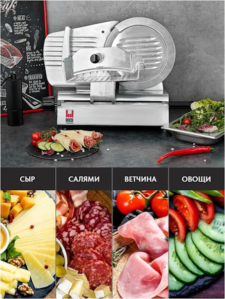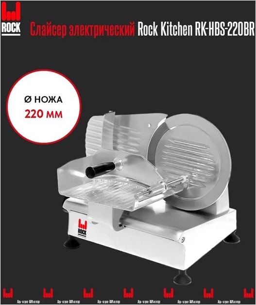 Гастрономический электрический слайсер ROCK KITCHEN RK-HBS-220BR предназначен для нарезки мяса, салями, ветчины, сыров и овощей ломтиками заданной толщины, благодаря чему сокращается время на подготовку холодных закусок. Оснащён съёмным затачивающим устройством, крепящимся на каретке.