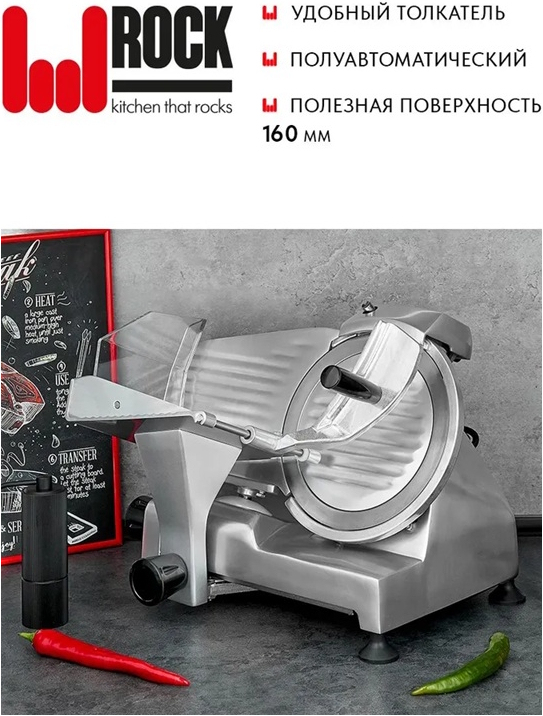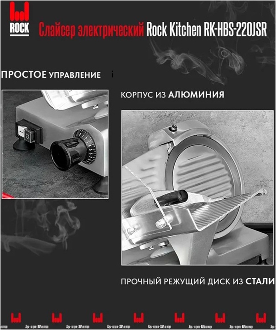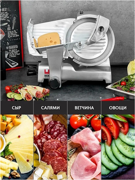 Гастрономический электрический слайсер ROCK KITCHEN RK-HBS-220JSR предназначен для нарезки мяса, салями, ветчины, сыров и овощей ломтиками заданной толщины, благодаря чему сокращается время на подготовку холодных закусок. Оснащён встроенным затачивающим устройством, закрепленным на каретку.