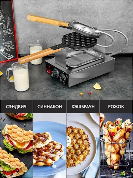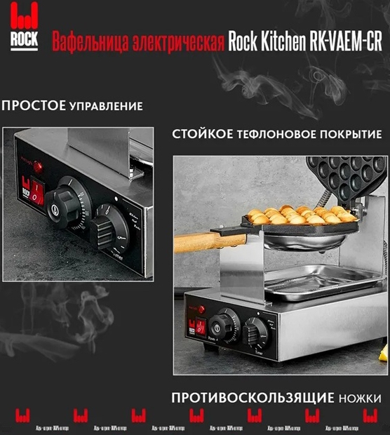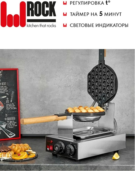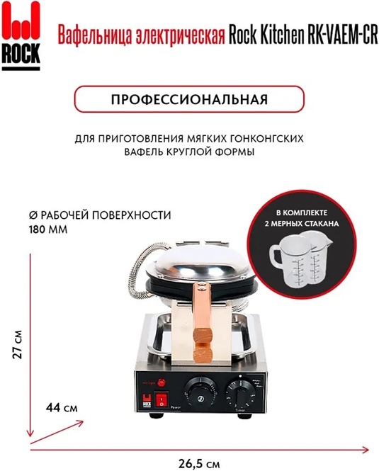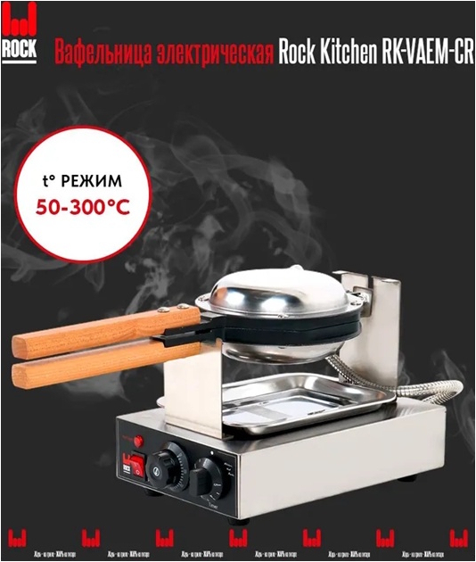 Электрическая вафельница ROCK KITCHEN RK-VAEM-CR предназначена для приготовления гонконгских вафель. Оснащена электромеханической панелью управления с таймером на 5 минут и терморегулятором, позволяющим установить необходимую температуру рабочей поверхности в пределах от+50 до +300 °С.
