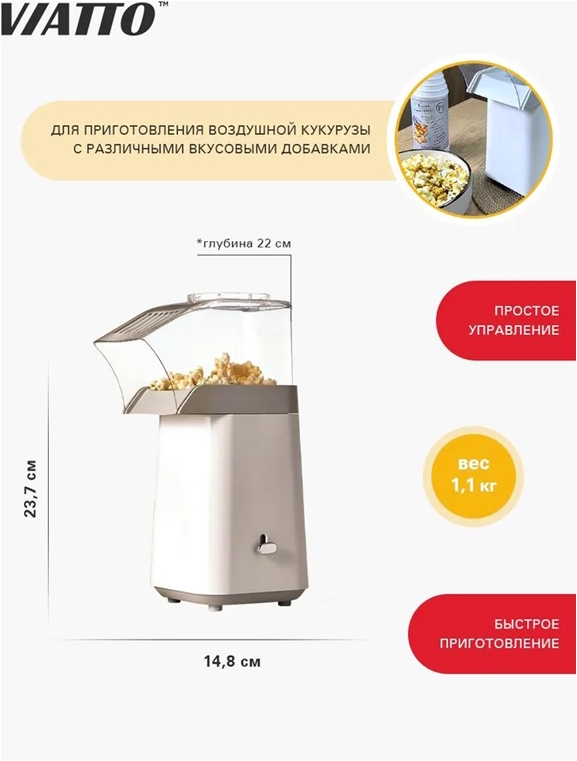 Аппарат VIATTO VA-PM918W предназначен для приготовления попкорна без использования масла. Корпус выполнен из пластика белого цвета, чаша – из алюминия с антипригарным покрытием, крышка – из прозрачного поликарбоната. Идеально подходит для использования на вечеринках, семейных мероприятиях и праздниках.