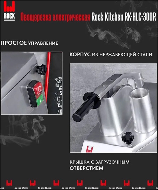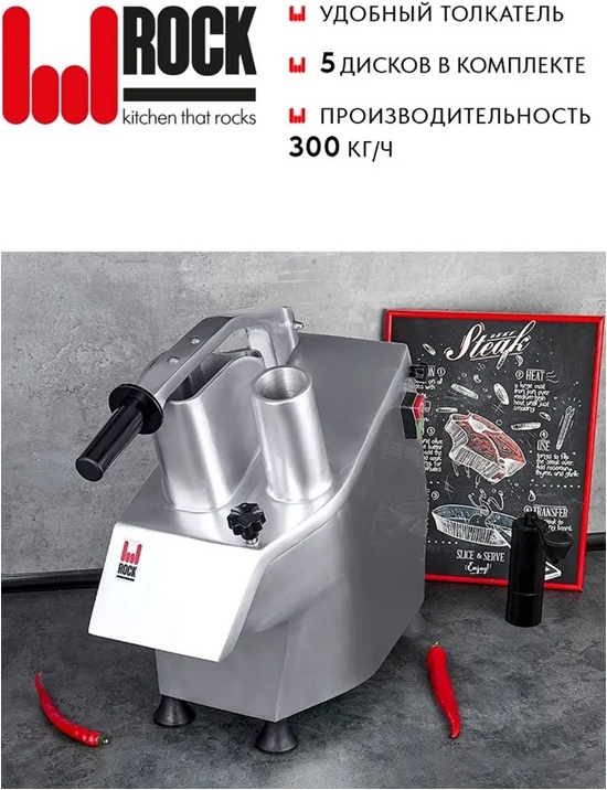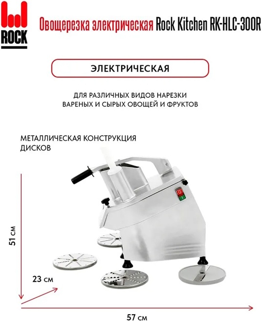 Электрическая овощерезка ROCK KITCHEN RK-HLC-300R предназначена для нарезки сырых и варёных овощей, фруктов и других продуктов на небольшие кусочки. Поверхности, соприкасающиеся с продуктами, тщательно отполированы, что обеспечивает лёгкость очистки. Корпус и крышка с загрузочным отверстием изготовлены из нержавеющей стали, кромка лезвий специально заточена для достижения аккуратного внешнего вида поверхности среза.