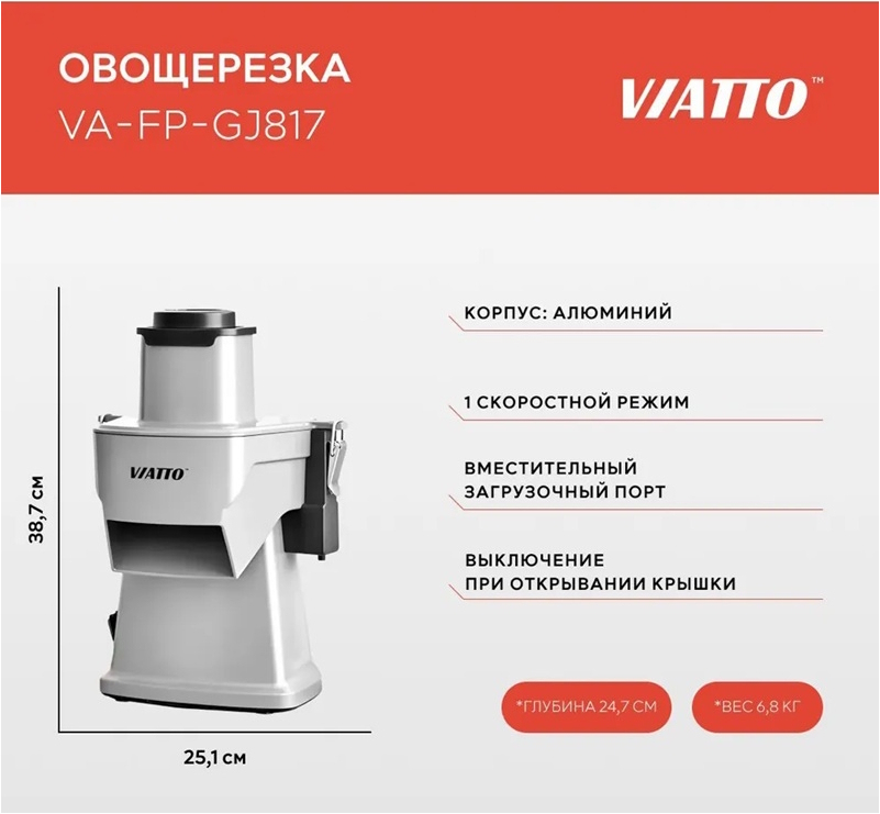 Овощерезка VIATTO VA-VC65MS предназначена для нарезки сырых и варёных овощей на небольшие кусочки. Поверхности, соприкасающиеся с продуктами, тщательно отполированы, что обеспечивает лёгкость очистки. Имеет водонепроницаемый выключатель. Корпус и крышка выполнены из алюминиевого сплава.