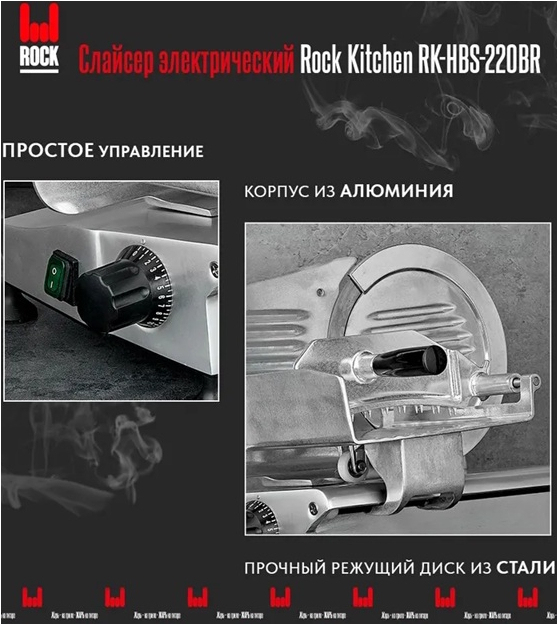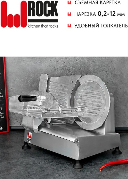 Гастрономический электрический слайсер ROCK KITCHEN RK-HBS-220BR предназначен для нарезки мяса, салями, ветчины, сыров и овощей ломтиками заданной толщины, благодаря чему сокращается время на подготовку холодных закусок. Оснащён съёмным затачивающим устройством, крепящимся на каретке.